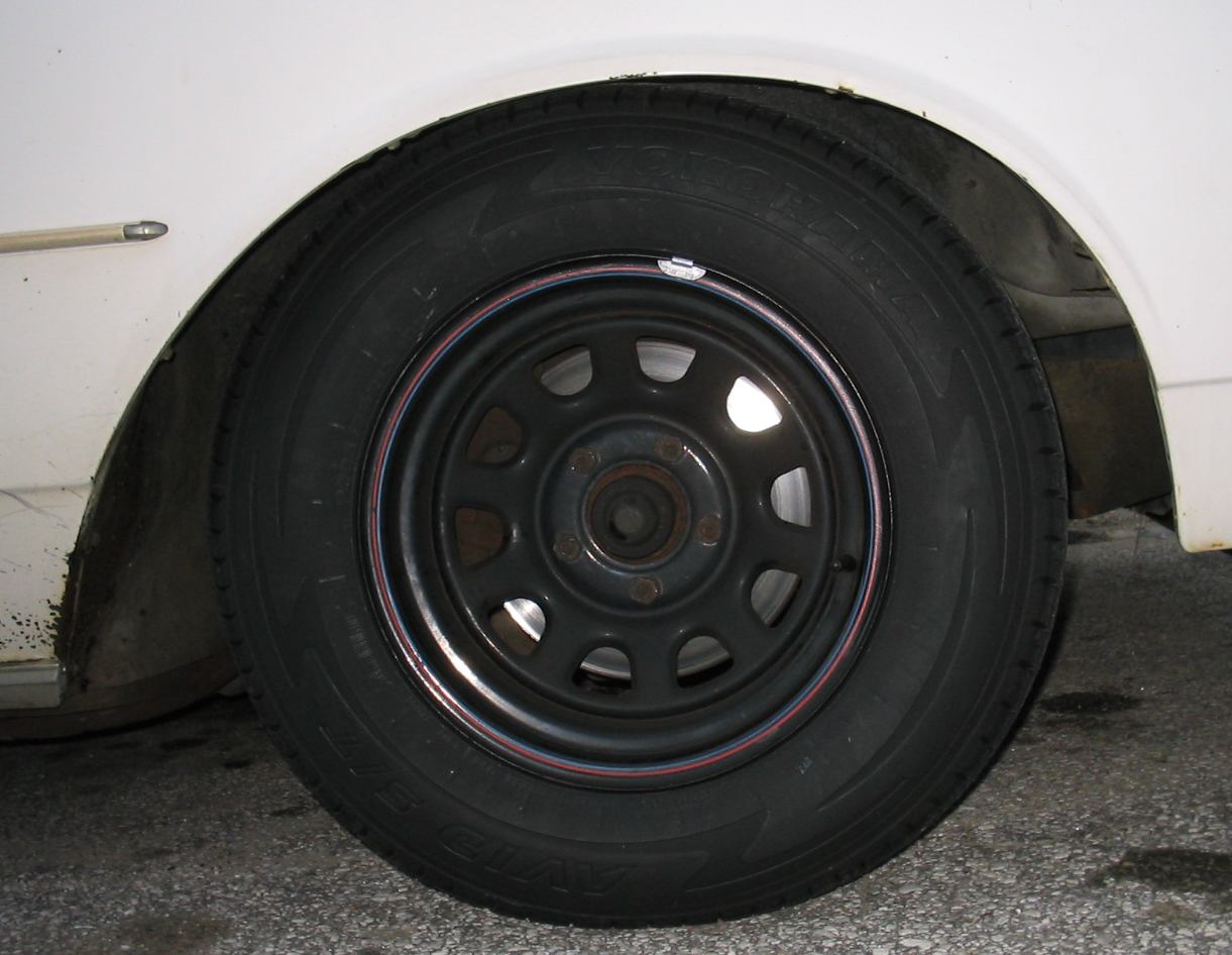 The replacements are 225/70-15 Yokohama Avid S/T's, which look like balloons and have a ridiculous pattern on the sidewalls. But they were cheap and highly-rated, so what the hell. They sure as hell fill out the wheel wells!