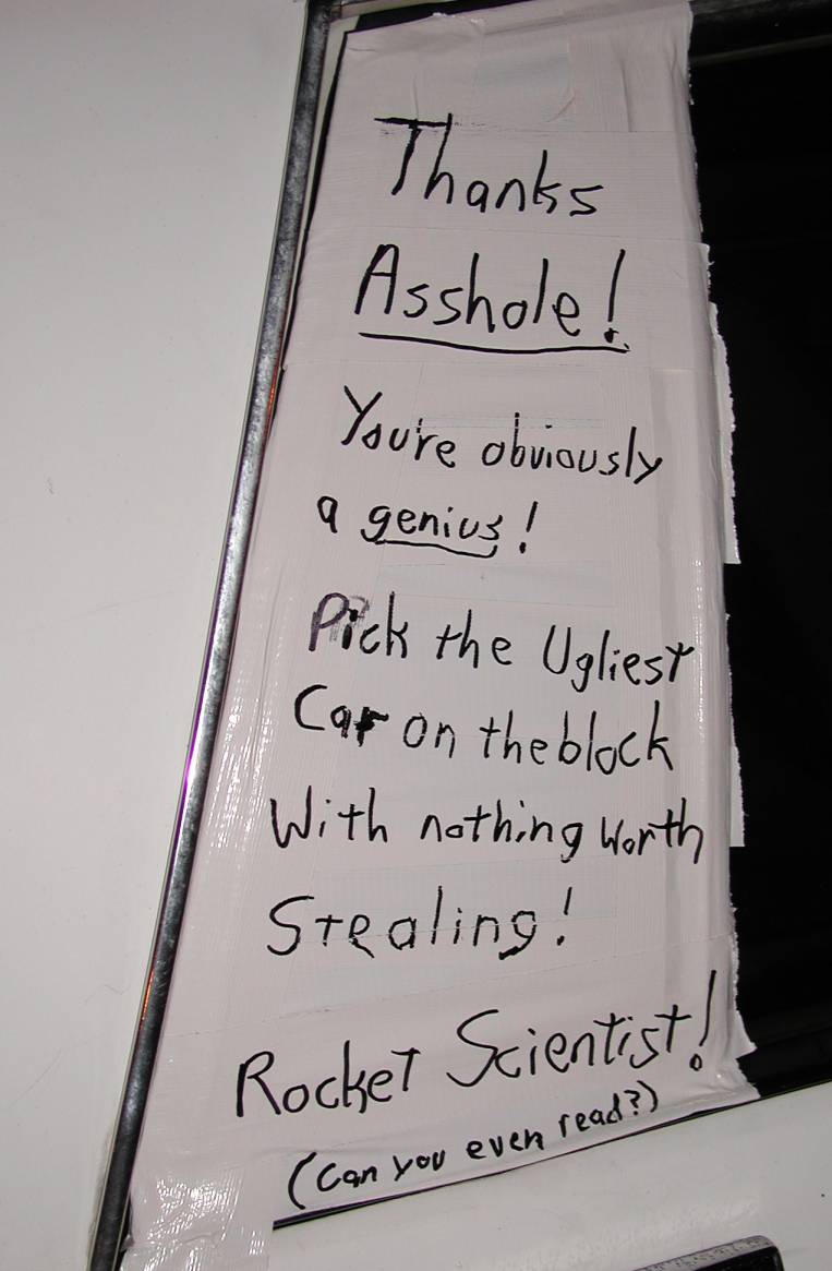 The third night I parked her on the street, some schmuck broke out my quarter window. I responded appropriately until I could replace it. Mind you, I was parked between a Porsche and a C5 Corvette, dammit! They didn't even open the door.